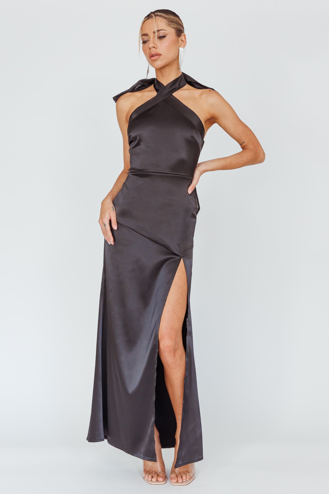 Andria Halterneck Bow Satin Maxi Dress Black