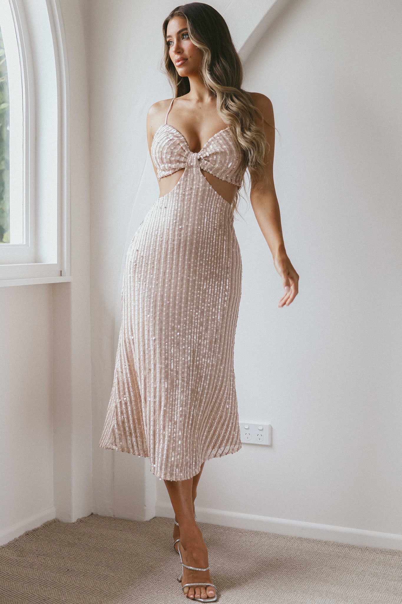 Jaws will drop when you strut by in our super hot Acapulco midi dress. Featuring a stunning. striped sequin fabric and cut-out waist. We are obsessed! Perfect for a glitzy birthday celebration or special event! Team it with a chic mini purse and strappy. tie-up heels for an unforgettable look!