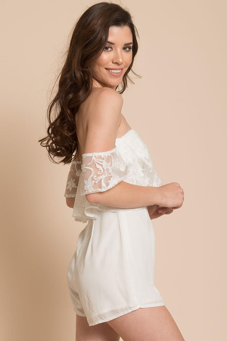 Stunning lace overlay makes this open back and off the shoulder romper perfect for any club night. Wear with strappy black heels and glowing makeup.