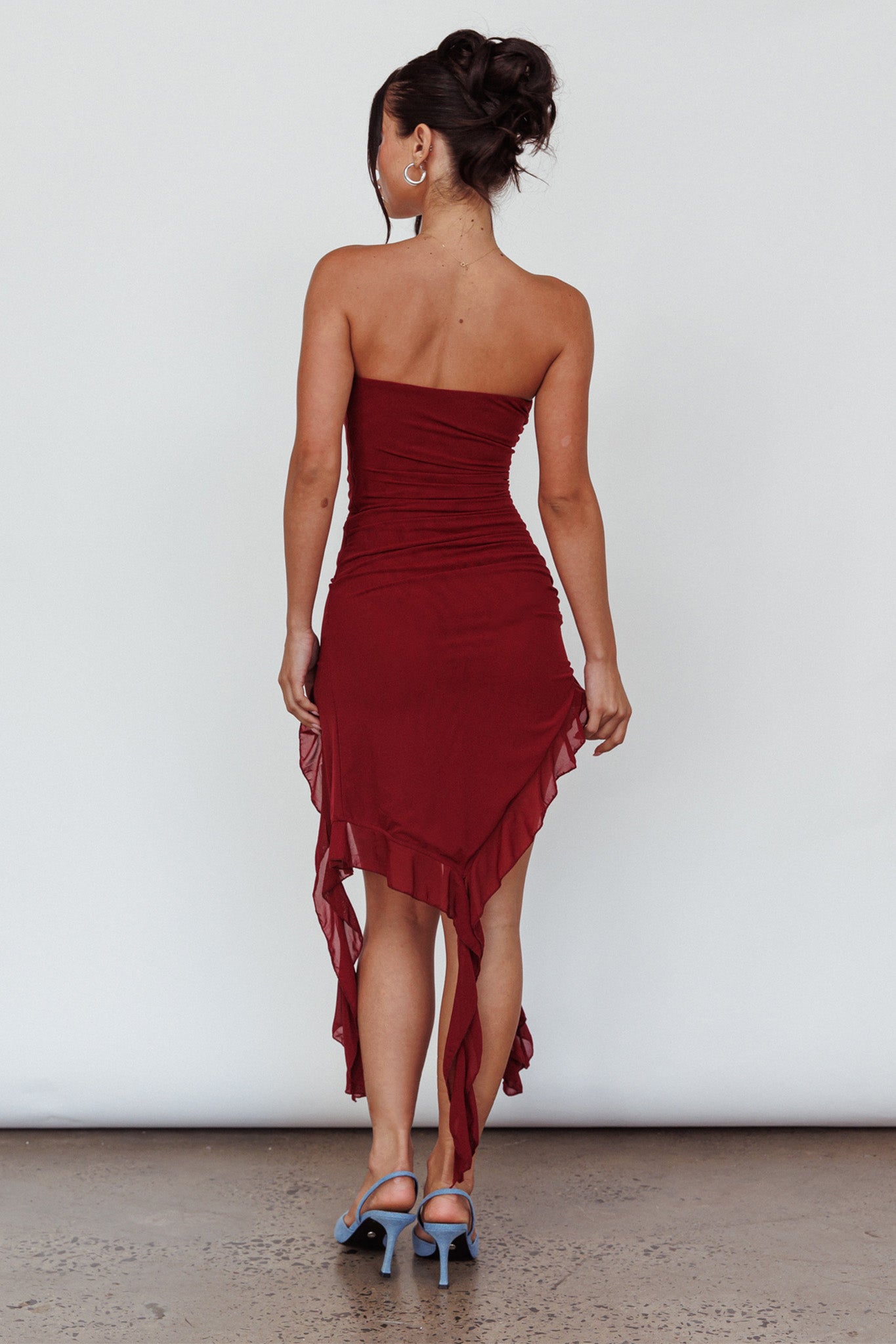 Steal the show in our hot After Party mini dress. We are obsessed with its ruffle detail and strapless cut. giving us all the throwback vibes. Team it with kitten heels and a baguette bag to complete the look.