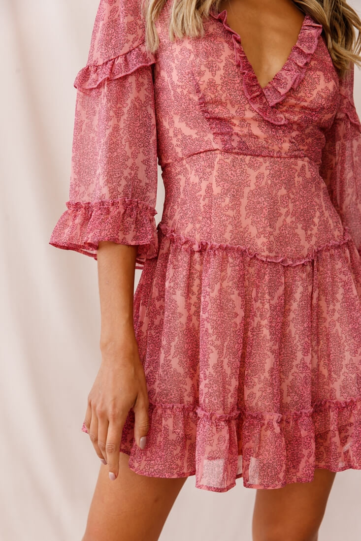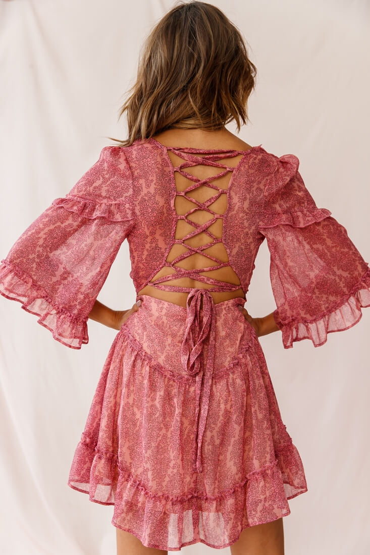 Turn heads wherever you go in this super cute dress featuring ruffle-fringed. billowy 3/4 bell sleeves. a tiered ruffle skirt and our favorite part. the lace-up back! We are loving the soft. floaty chiffon fabric. Perfect for your next event or lunch with your gal pals. Team it with single strap black heels or pointed-toe flats and a tote. Style queen!