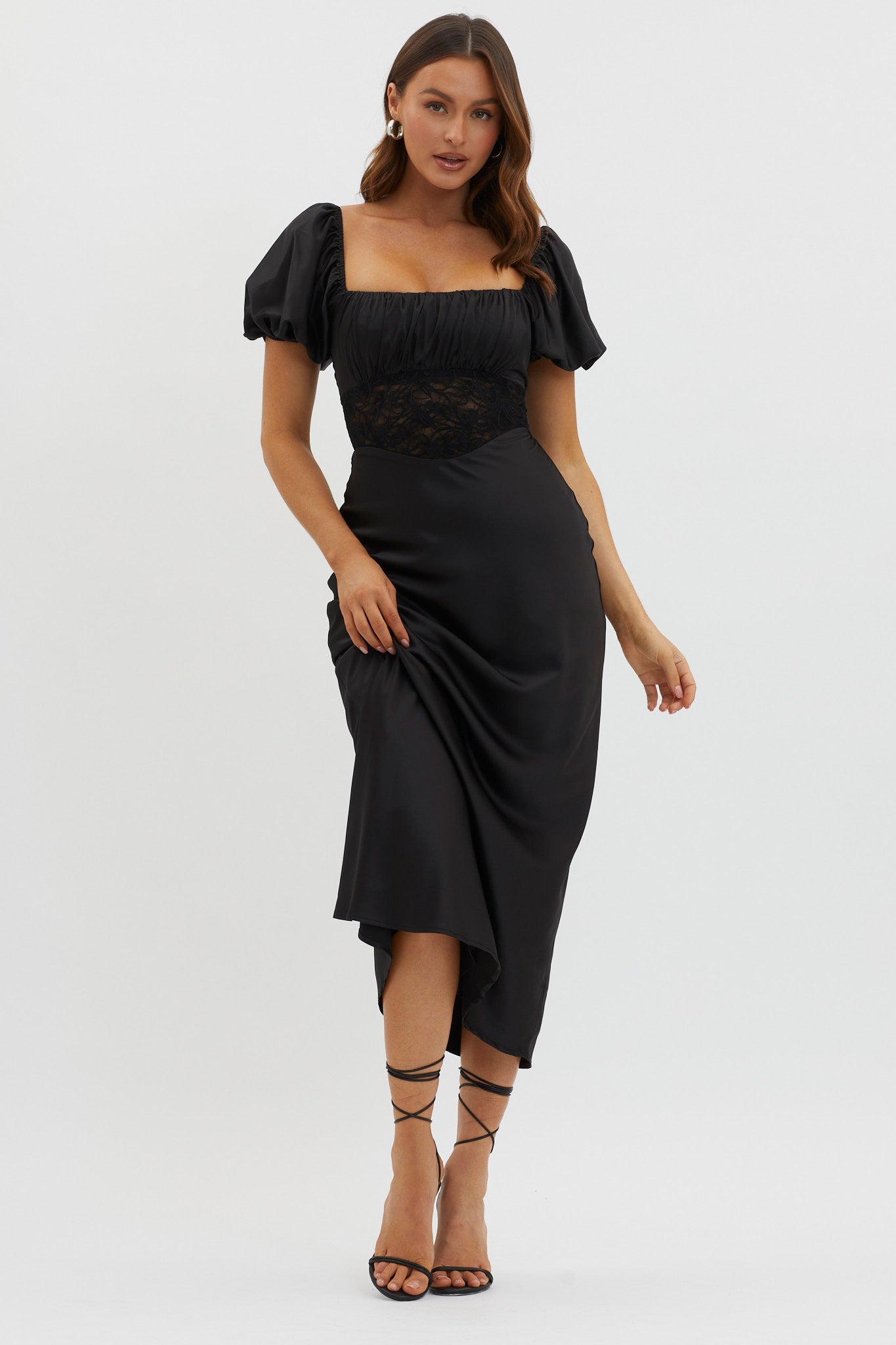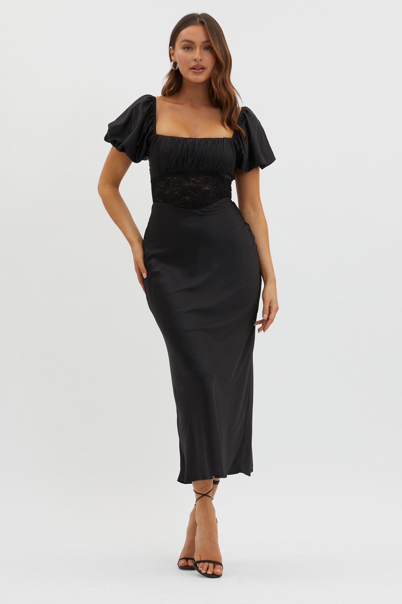 Turn heads in our super chic Allianna midi dress. We are in love with its lace waist detail and feminine puff sleeves. It's perfect for a wedding or romantic date night with your love. Team it with strappy. black heels and a clutch for an unforgettable look.